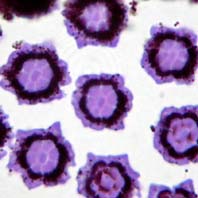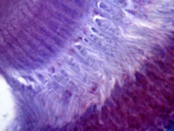 Die Rhabdomere unter den Kristallzellen sind die eigentlichen Organe der Photorezeption. Im Bild ist ein Querschnitt durch die Ommatidien in Höhe der Rhabdomere zu sehen. Auffällig ist die regelmäßige Anordnung der einzelnen Rhabdomere in einem Ommatidium zu einem Rhabdom. Je sechs Rhabdomere sind um ein siebtes Rhabdomer gruppiert. Eine Verschmelzung der einzelnen Rhabdomere hat nicht stattgefunden. Vielmehr zeigen sich deutliche Lücken zwischen den einzelnen Rhabdomeren. Das Bild eines Längsschnitts (Seite 5) lässt unter dem siebten Rhabdomer ein achtes vermuten. Das Mückenrhabdom der untersuchten Art als unfusioniertes offenes Rhabdom mit acht Rhabdomeren entspricht daher den Beschreibungen, wie sie sich in der Literatur für das Dipterenauge (Das |