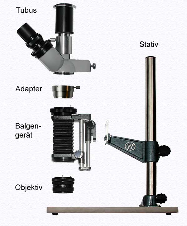 Bild sehen Sie, wie das Makroskop aus diesen Komponenten aufgebaut ist.